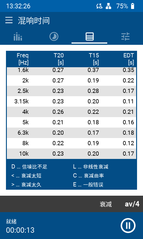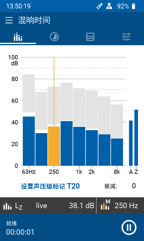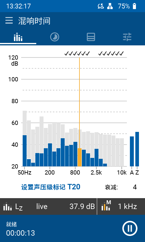XL3 使用标准的 T20 或 T30 方法测量 63 Hz - 8 kHz 的倍频程混响时间。脉冲声源或带闸粉噪声都可激发测量。声学分析仪能自动平均所有测量位置的声音衰减。此外,安装室内声学扩展选件即可测量 1/3 倍频程混响时间,计算房间的空间平均结果并同时测量  T30/T20/T15/EDT 结果。它甚至能录制声音衰减过程以便后续分析。