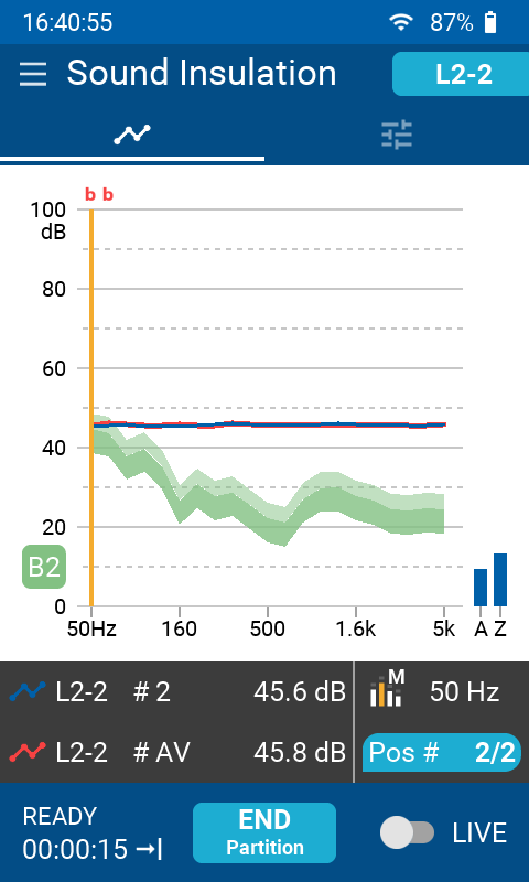 现在,XL3 的建筑声学模块可以直接在仪器上测量空气声隔声,撞击声隔声和外墙隔声。只需在声源室和接收室执行测量,即可现场在仪器上查看建筑隔声结果。对于共用声源室或接收室的隔墙,XL3 提供数据复用功能,比如直接使用之前测量的混响时间或背景噪声数据,让你事半功倍。为了避免人体本身的声吸收影响结果,你可以离开测量房间并通过联网的手机直接控制室内的仪器。