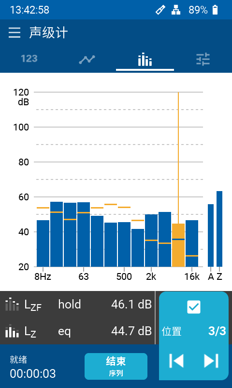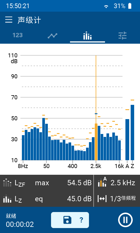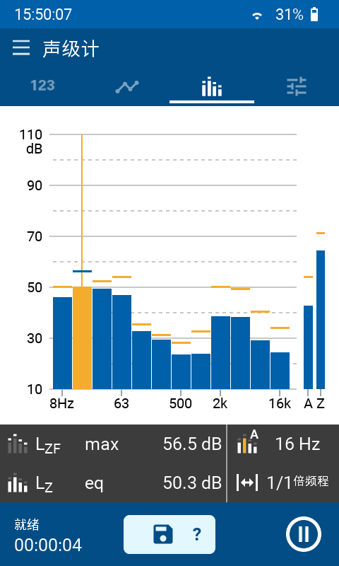 XL3 的 1 级滤波器在 6.3 Hz 至 20 kHz 范围内测量 1/1 倍频程或 1/3 倍频程分辨率频谱。它还同时测量全频带的最小,最大和平均声压级。频率轴可以自由滚动缩放,比如显示 125 Hz - 8 kHz 的内容用于噪声调查。所选频率范围的声压级也将一并呈现。