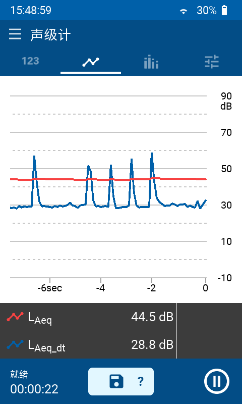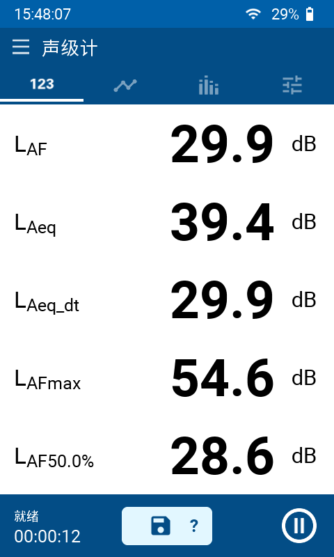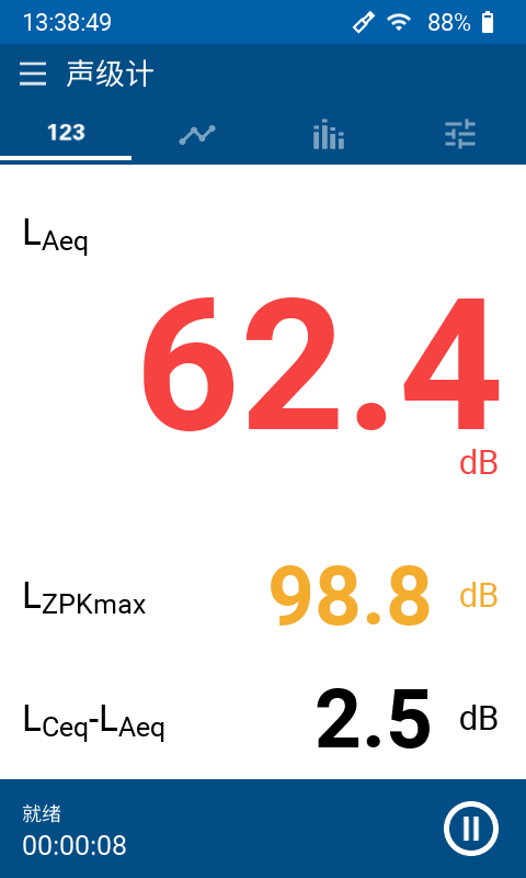 • 实时,Lmin,Lmax,Lpeak,Leq,移动时间 Leq