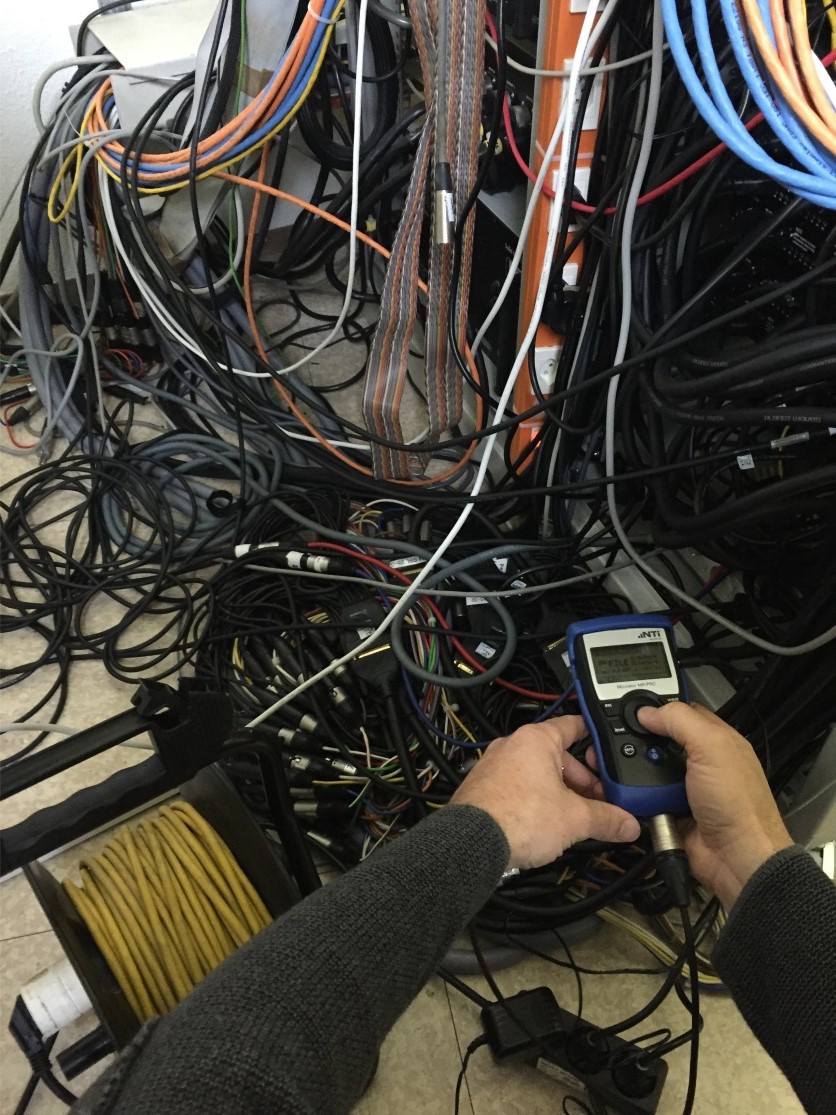 下图是在一家录音棚拍到的,我想很多系统应该都和这个类似,各种设备和一堆缆线,有时候根本分不清哪根线接什么东西。这时候首先就要对它们进行识别。你可以在缆线一端输入一个测试信号,再在另一端测试,这样很容易就区分不同的接线。