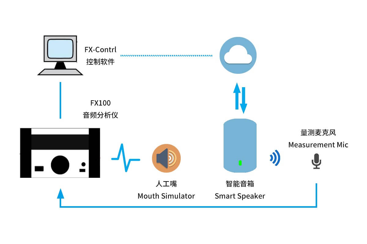 因为设备不提供扬声器的物理输入端(在不破坏音箱的前提下),信号由云服务或其它设备无线输入。因为信号发生器无法直接与待测体连接,我们把这类扬声器测试称为开环测试。