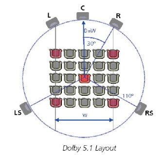 左图为杜比公司推荐的 5.1 声道扬声器摆放角度